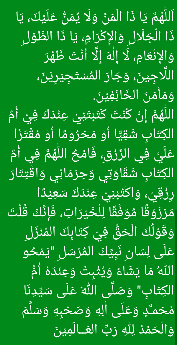 اللّٰهُمَّ إِنْ كُنْتَ كَتَبْتَنِيْ عِنْدَكَ فِيْ أُمِّ الكِتَابِ شَقِيًّا أَوْ مَحْرُومًا أَوْ مُقْتَرًّا عَلَيَّ فِي الرِّزْقِ، فَامْحُ اللّٰهُمَّ فِي أُمِّ الكِتَابِ شَقَاوَتِي وَحِرْمَانِي وَاقْتِتَارَ رِزْقِيْ، وَاكْتُبْنِيْ عِنْدَكَ سَعِيْدًا مَرْزُوْقًا مُوَفَّقًا لِلْخَيْرَاتِ، فَإِنَّكَ قُلْتَ وَقَوْلُكَ الْحَقُّ فِيْ كِتَابِكَ المُنْزَلِ عَلَى لِسَانِ نَبِيِّكَ المُرْسَلِ “يَمْحُو اللّٰهُ مَا يَشَاءُ وَيُثْبِتُ وَعِنْدَهُ أُمُّ الكِتَابِ” وَصَلَّى اللّٰهُ عَلَى سَيِّدِنَا مُحَمـَّدٍ وَعَلَى اٰلِهِ وَصَحْبِهِ وَسَلَّمَ وَالْحَمْدُ لِلّٰهِ رَبِّ العَــالَمِيْنَ
